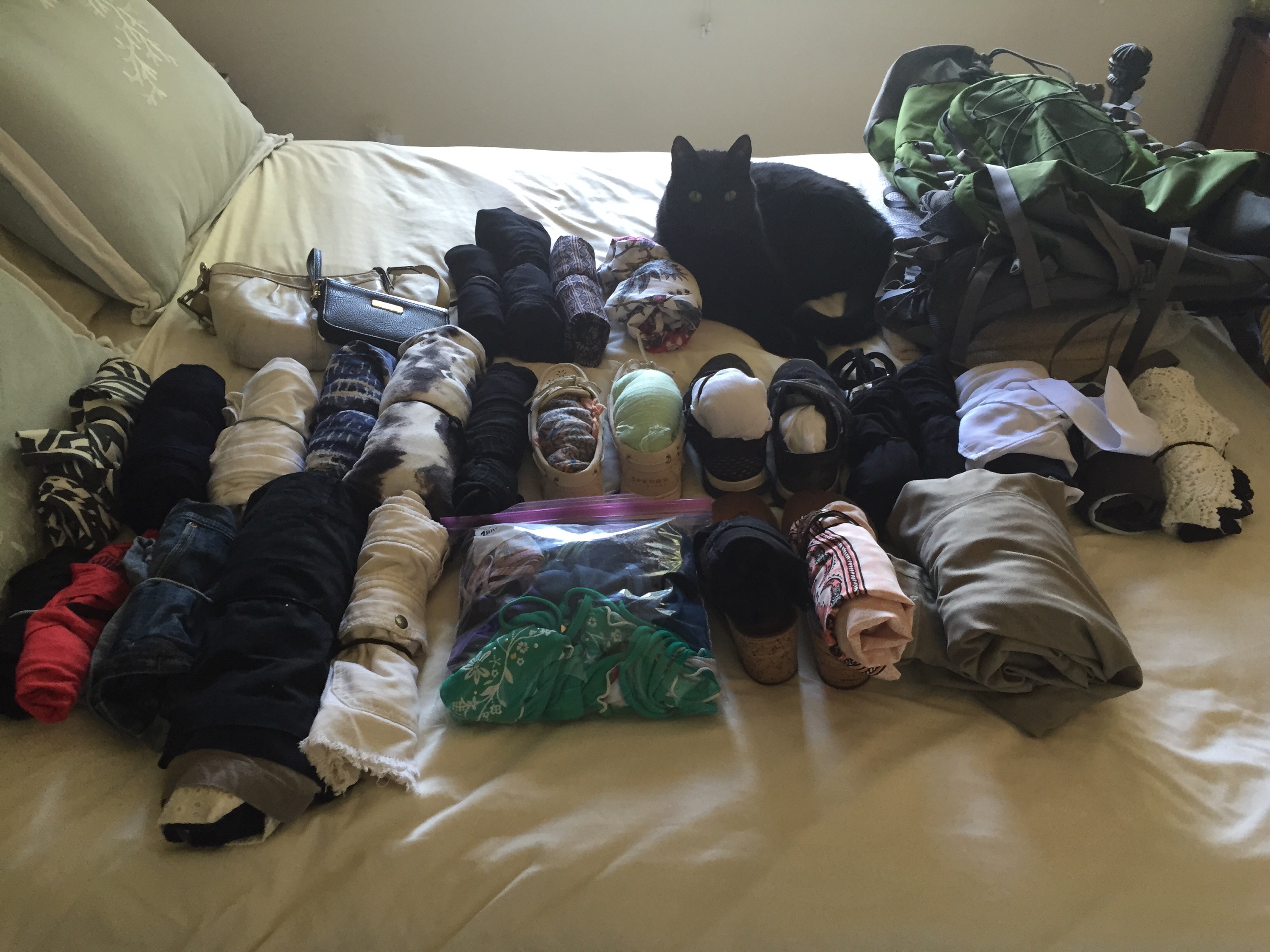 Packing is almost complete! Above is nearly everything I’ll be taking for my 7 week journey… minus the cat, sadly. In case you are a fashionable prospective international traveler, here are tips on how to pack and a list of what I packed: