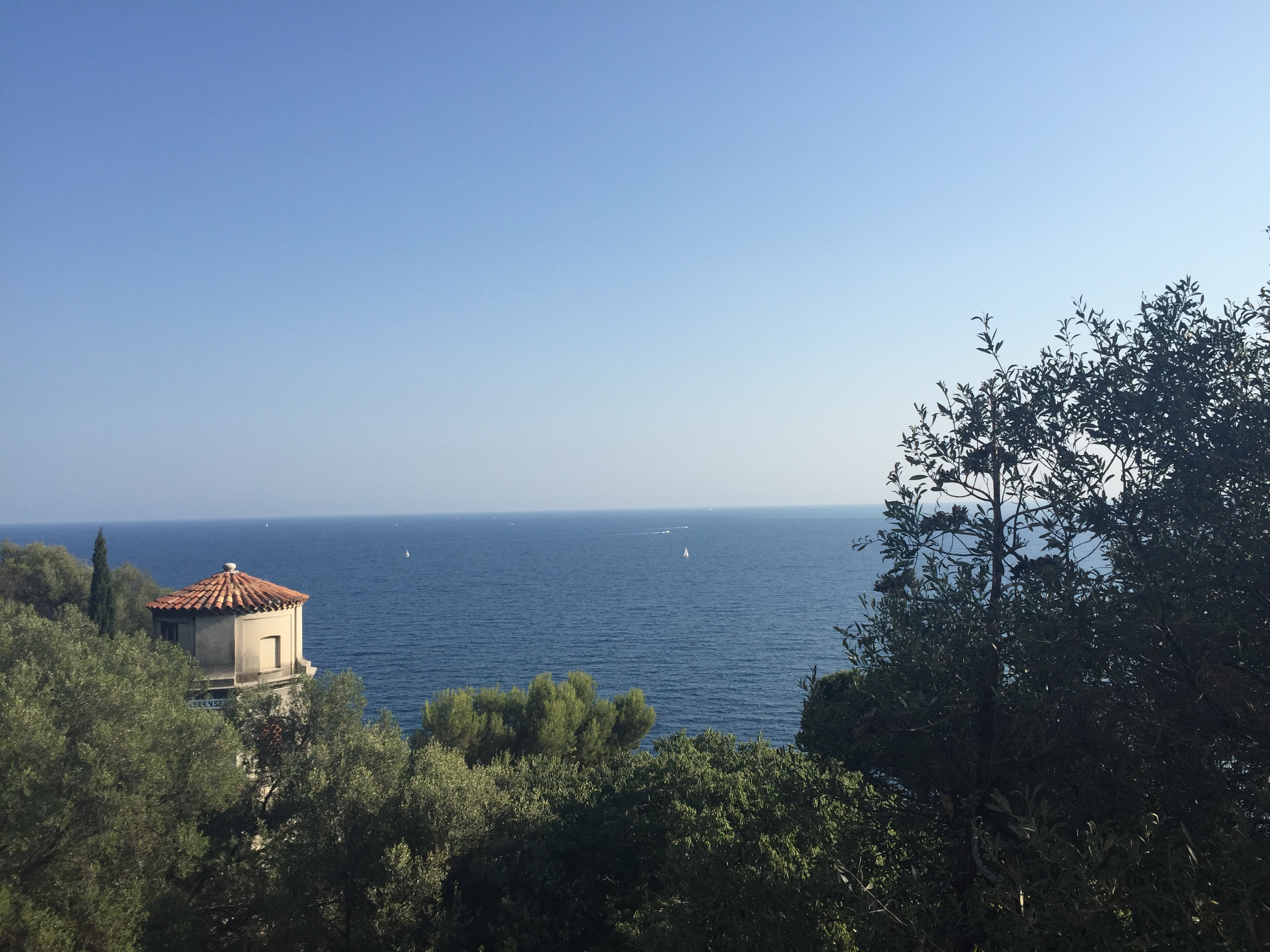 – A long leisurely European lunch at a café within the flower market. With a few hours to kill until our room would be ready, we took our time walking to get lunch. Just adjacent to our hotel side street, full of upscale bistros, was the main street, Avenue Jean Medecin, which takes you to Place Massena, Nice’s main square. Pedestrian friendly Avenue Jean Medecin is full of commercial retailers, but Place Messena is beautiful. Lining the square are seven statues on tall posts that almost look like Buddha’s sitting cross-legged. The seven statues actually represent the seven continents, and at night, when all the statues are illuminated and change colors, the color transformation represents the various languages in our world and the communication between our diverse communities within various societies. At first I thought the statues seemed out of place, but after learning their significance, I thought they were pretty awesome. A checkerboard of black and white squares of sidewalk revolves around the square’s focal point, a fountain topped by a larger than life, and buck naked, Apollo. Behind the fountain are marble stairs that lead to the Promenade des Anglais, a four-mile-long seaside path paved entirely in marble. We walked to the left of the Apollo fountain and entered Cours Saleya. At the beginning of Cours Saleya we found the flower market, which actually used to be France’s largest flower supplier. We chose the first café we saw within this flower market and grabbed an outdoor table. Though touristy and overpriced because it was touristy, we gabbed, ate, drank a couple of glasses of vin blanc, and people watched for a few hours. When we finally made it back to our hotel to get into our room, we bounded up the stairs, turned on all the fans in the room, and without speaking, fully clothed, both plopped on top of the beds and passed out for three or more hours.