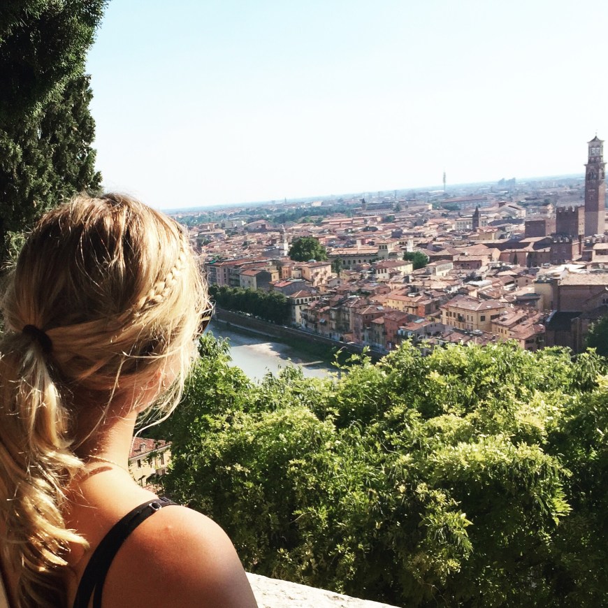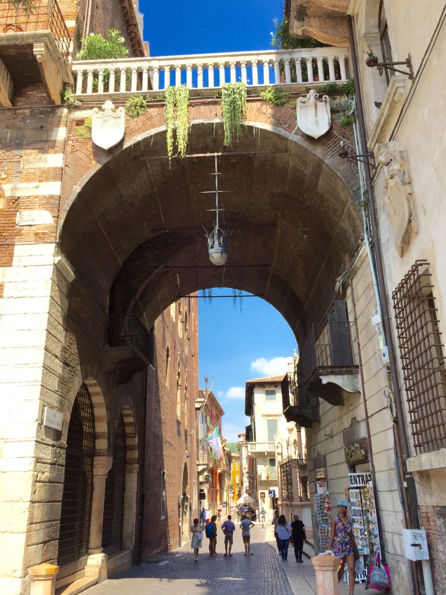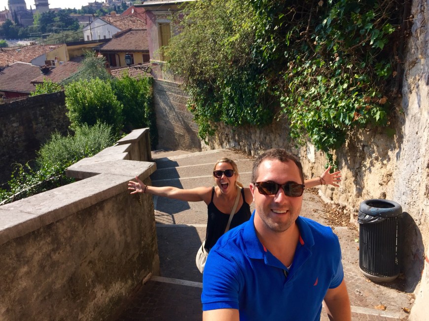 -Walking. Our hotel overlooked the Arena di Verona, the Roman amphitheater that is still in use today for opera performances, which is in Piazza Bra, one of the biggest piazzas in Verona. Therefore, we were staying in a central location, ideal for walking…though, as long as you stayed within the city limits, I think you’d be fine for walking no matter where you chose to stay in Verona, it’s a manageable destination that begs to be taken in afoot. Alex and I wiled away the morning, noon, and evening strolling the piazzas, bridges, alleyways and stairs. We highly recommend burning some calories to reach the top of Castel San Pietro to be rewarded by the highest view of the city beneath the shade of the trees lining the Piazzale. If birds-eye-view seeking is a goal of yours, as it often is ours, be sure to also visit the Torre Dei Lamberti, where you can climb the winding stairs to the top for unbeatable views of the terracotta jig-saw puzzled landscape below. In addition to the high (literally) points of interest, Verona is ripe with gorgeous, only-in-Europe and Disney movies piazzas perfect for aimless strolling and fountain-side sitting. We recommend copping a seat near one of the fountains in any piazza in Verona to bemuse yourselves with people watching and a cacophonous soundscape of the pattering of the fountain, countless languages echoing against the stone and ivy walls, and street vendors chanting their persuasive hymns.