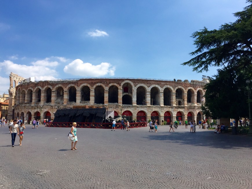 -Many restaurants lined the main square near Arena di Verona, which was quite literally next door to our hotel. We were pretty tired and hungry after walking the entire city and therefore didn’t have enough energy to quest for an off-the-beaten path gem for dinner. This being said, we plopped down at one of the outdoor patios lining the square of Piazza Bra for underwhelming plates of pasta that very well could have been ordered from an pizza delivery joint back home. Nonetheless, the glow of the backlit Roman amphitheater and the echo of children’s laughter as they bobbled through the stony square created for a romantic ambiance.