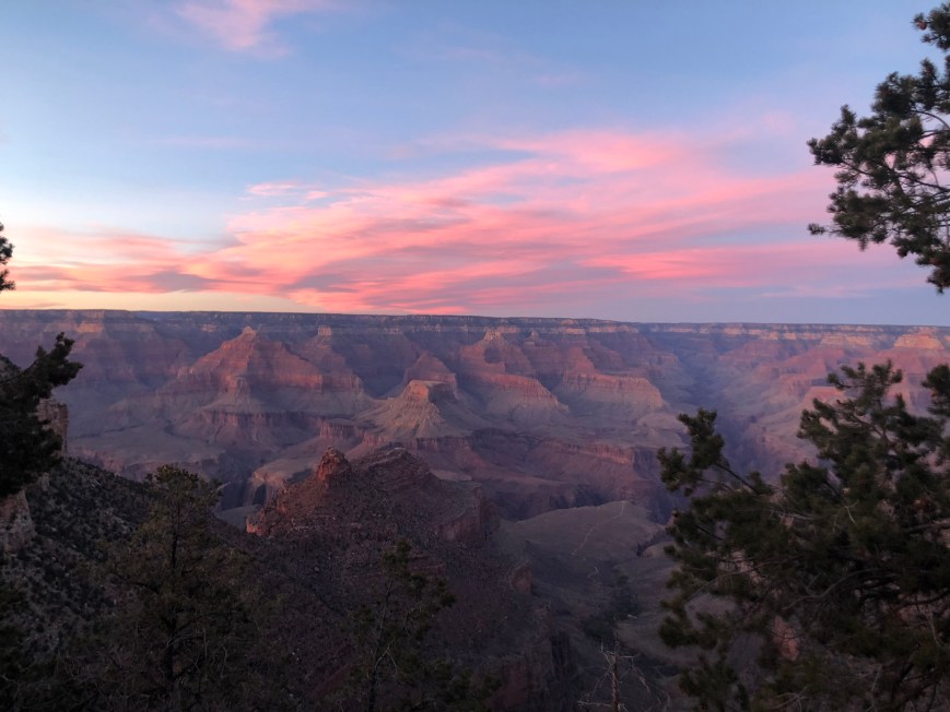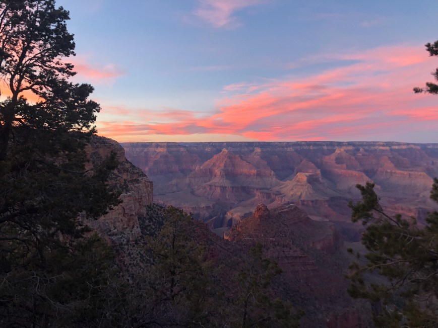 After returning to the top of South Kaibab and discussing our conclusion regarding canyon hiking, we decided to walk the rim trail instead of seeking another trail. Though it didn’t propel the heart rates as a trail hike would have, the rim trail was the perfect decision for us; there were barely any other people on it and so we got to take in the sounds, smells, and colors of the canyon in peaceful serenity. Our rim trail walk was concluded by a sunset over the canyon that seemed to grow more kaleidoscopic by each darkening minute. We opted to another dinner of appetizers at the El Tovar bar before calling it a night.