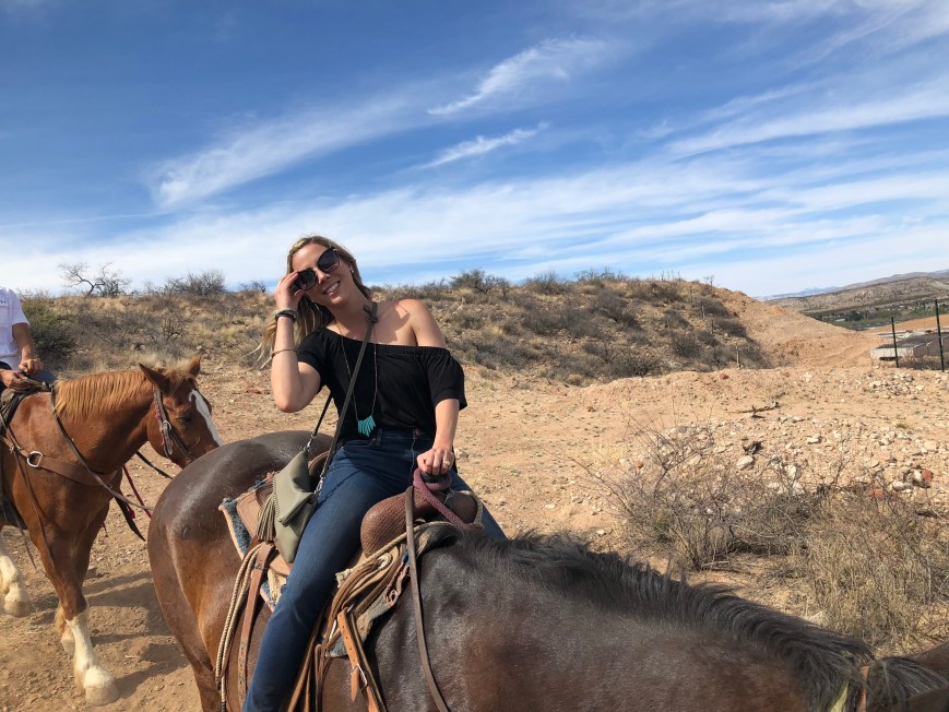 I booked our two hour horseback riding tour through a family owned and family run company called A Day in the West. Originally, our tour was to take place at a location about 5-10 minutes from our Air B and B, but unfortunately they had some kind of trouble with their van, the one that was due to pick us up to take us to the riding location, and ultimately they needed us to go to a much further location on our own set of wheels. We had rented a convertible, so we were happy to take a little cruise, however, this added a lot of time to our journey to and fro, and therefore disabled us from doing much else in the way of activities after the tour. The new location was far from authentic, as it shared a parking lot and geographic lot with an exotic zoo park of sorts. Regardless, the family who ran the tour was charming, friendly, and fascinating. We learned about the history of Arizona, shared some laughs in response to some old gun slinging, cowboy jokes bellowed by our cowboy guides, and clip clopped through hilly, dusty desert back country. I am not sure why, but they put me on their biggest horse, John. He was a trusty gentleman.