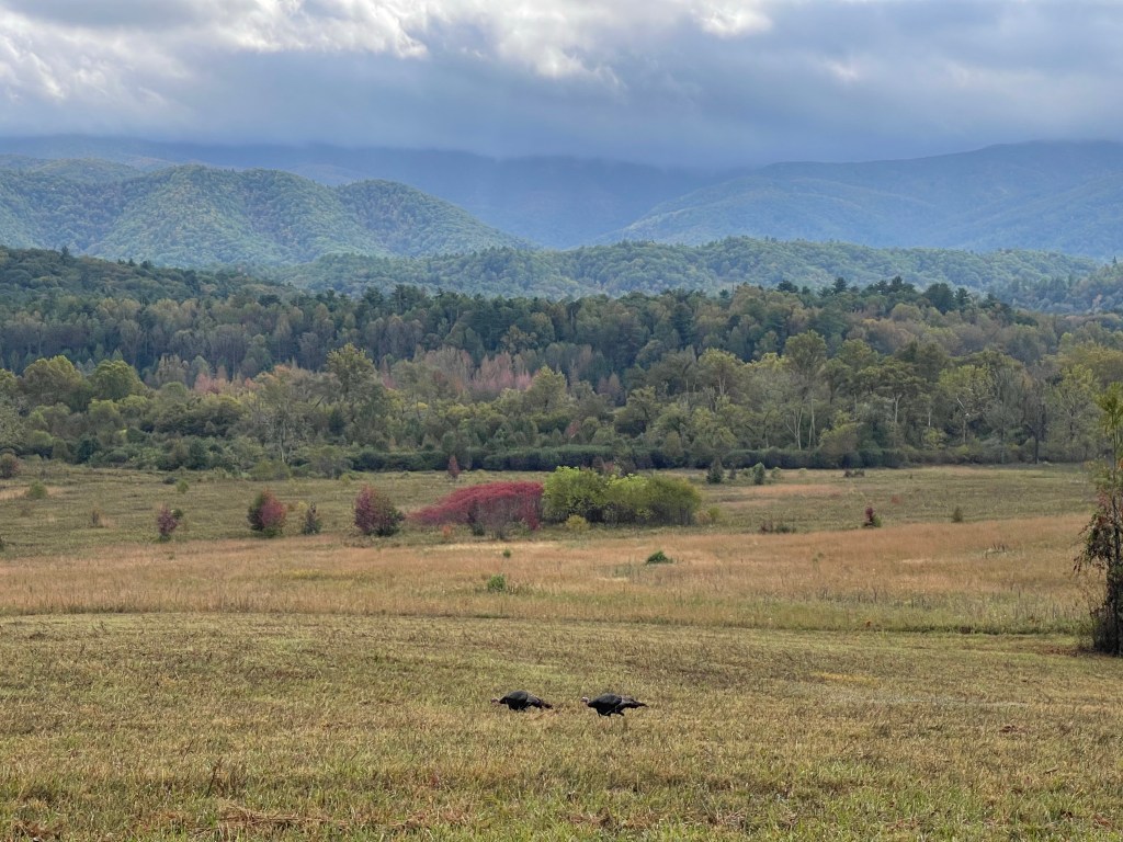 Today marked the only rainy-ish day we had the entire adventure. We didn’t think it wise to brave a hike in the rain, so we settled for a scenic drive around Cades Cove loop. This loop is pretty heavily trafficked and can move slowly due to wildlife sightings, so this was about a 2 hour activity. It was the perfect thing for us to do on that rainy day. Since the RV was moving at a crawl, I sat with Claire on my lap and it felt pretty close to a cozy hayride through pastoral paradise. We saw wild turkeys, open fields framed by the colorful mountains, and most exciting of all, black bears!! I spotted a baby black bear off in the distance and then the line up of cars in front of us all got turns to slowly drive by and observe the mama and her cubs playing in a grassy knoll. Unfortunately for us, when it came our turn to view the furry family, they decided to pad off behind the hill and out of sight. Nonetheless, it was a great way to spend a few hours in the park.